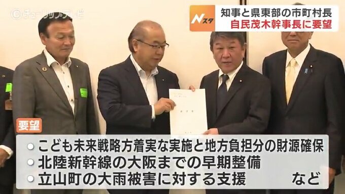 要望書には、こども未来戦略方針の着実な実施と地方負担分も含めた財源確保、北陸新幹線の大阪までの早期整備のほか、立山町の大雨被害に対する支援などが盛り込まれています。