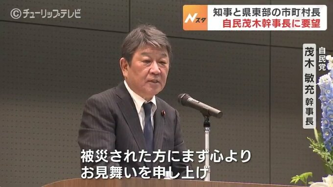 新田知事と県東部の市町村長が、自民党の茂木幹事長に6月28日に発生した大雨被害への支援などを要望。その後の講演会で茂木幹事長は「国をあげて全力で取り組みたい」と述べました。