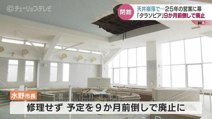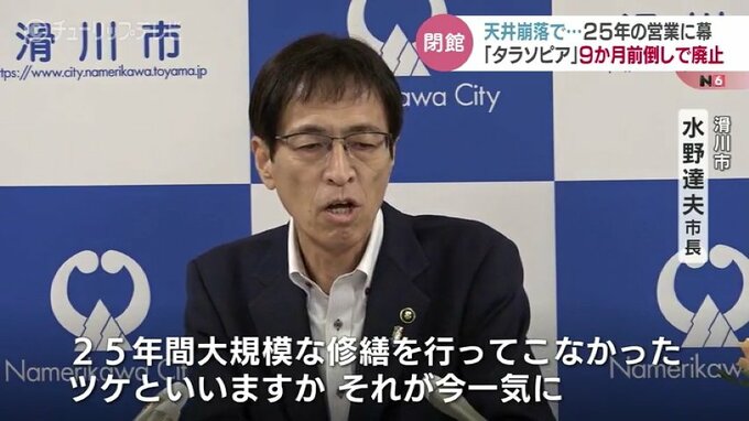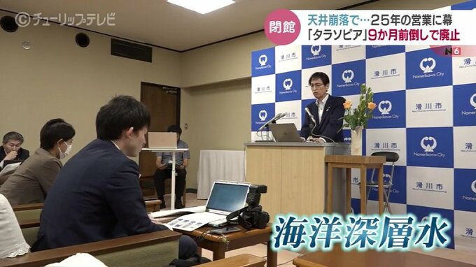 一部天井が崩落し、臨時休館している富山県滑川市の海洋深層水体験施設「タラソピア」について、水野市長は3日、このまま再開せずに廃止すると発表しました。