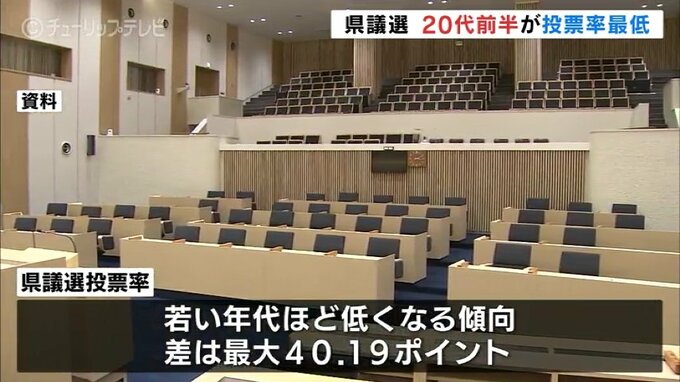県がまとめた県議選の年代別投票率の推計によりますと、最も投票率が高いのは70代前半で62,29パーセント、最も低いのは20代前半で22,10パーセントでした。