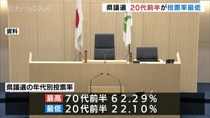 ことし4月に行われた富山県議会議員選挙の年代別投票率で、投票率が最も低いのは20代前半で22,10パーセントでした。