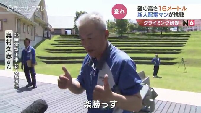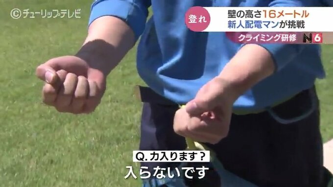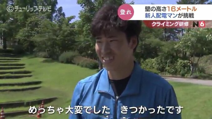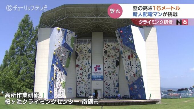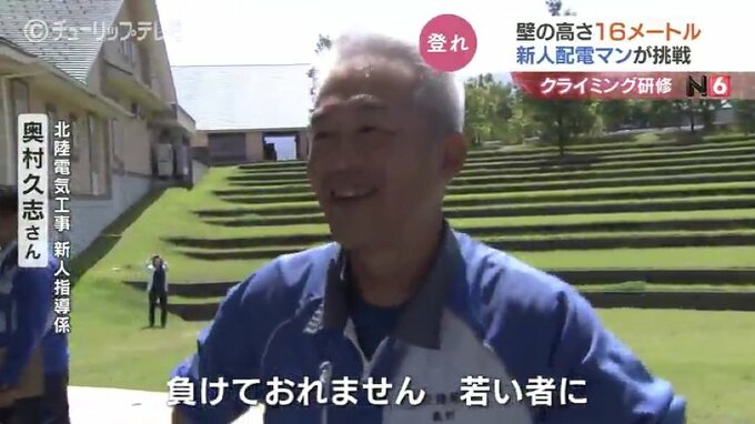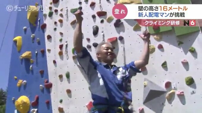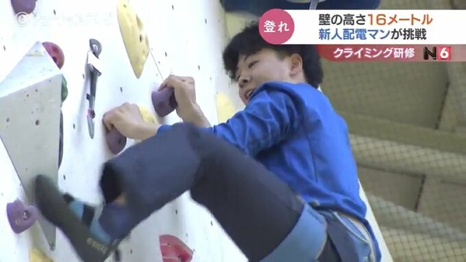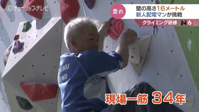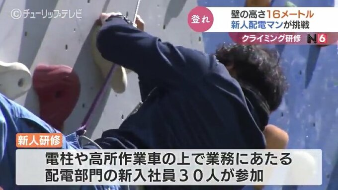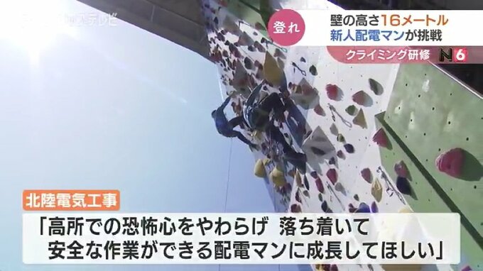高さ16メートルの壁で研修です。電柱や高所作業車の上で業務に当たる北陸電気工事の新入社員がスポーツクライミングに挑戦し、高所作業に必要な体の動かし方を学びました。