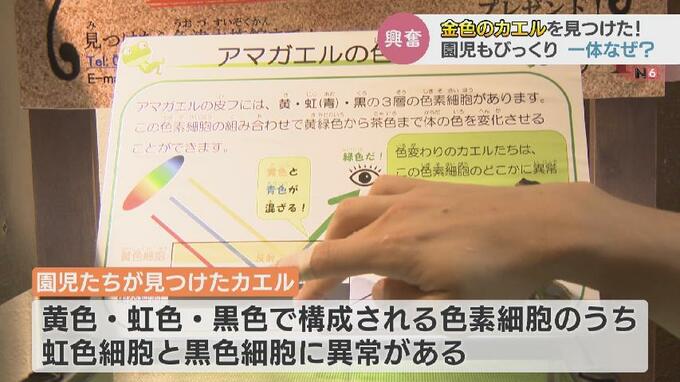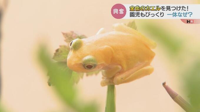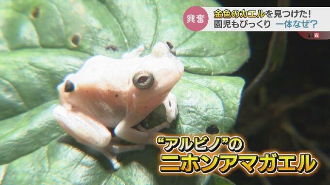 園児たちが見つけたのは色素に異常がある、「アルビノ」の二ホンアマガエル。黄色、虹色、黒色の3つで構成される色素細胞のうち虹色細胞と黒色細胞に何かしらの異常があるといいます。