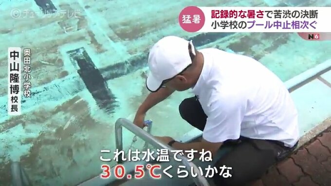 奥田北小学校 中山隆博 校長:「水温ですね。今30.5℃くらい。(温度計の気温は)今の段階では(午後1時すぎ)40℃ですね。だから合わせて70ということになりますので…この状態ではプール開放には適していないという判断にはなります」
