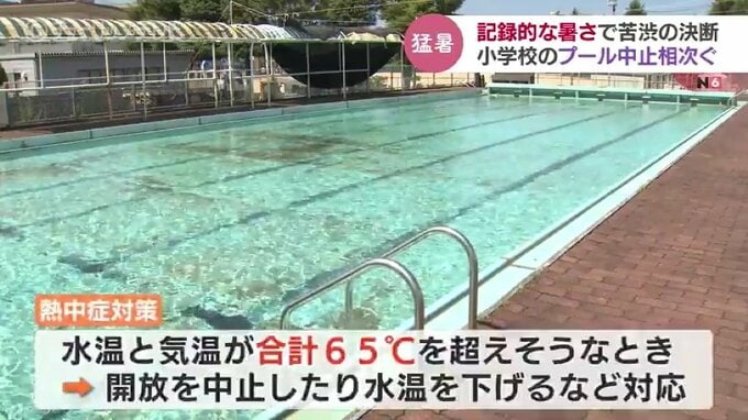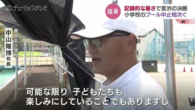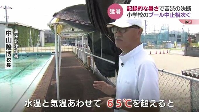 奥田北小学校 中山隆博 校長:「水温と気温あわせて65℃を超えるとどうしても熱中症の危険度が高まるということで、日本水泳連盟の方でもプール使用には適さないということでそこの範囲を見極めながら進めています」