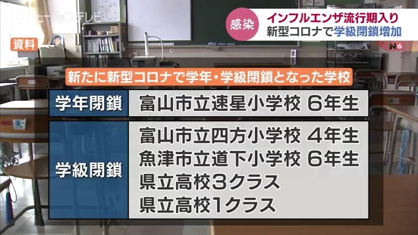 富山県は20日、県内がインフルエンザの流行シーズンに入ったと発表しました。一方、新型コロナの感染による学校の学年・学級閉鎖も増えています。