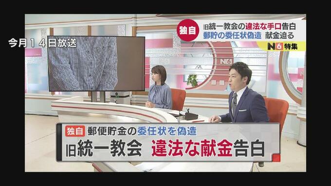 キャスター:「“教団の悪質な献金の手口を知ってもらいたい”決意の告白です」