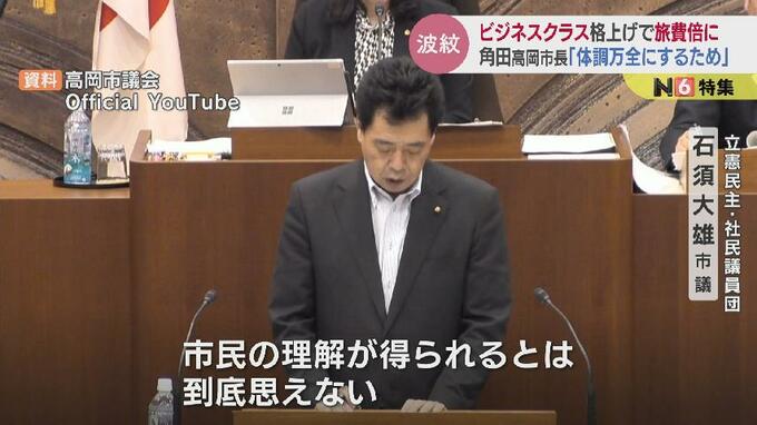 石須大雄市議:「旅費の規定で許可されているからと飛行機でファーストクラスやビジネスクラスを利用することに、市民の理解が得られるとは到底思えない。