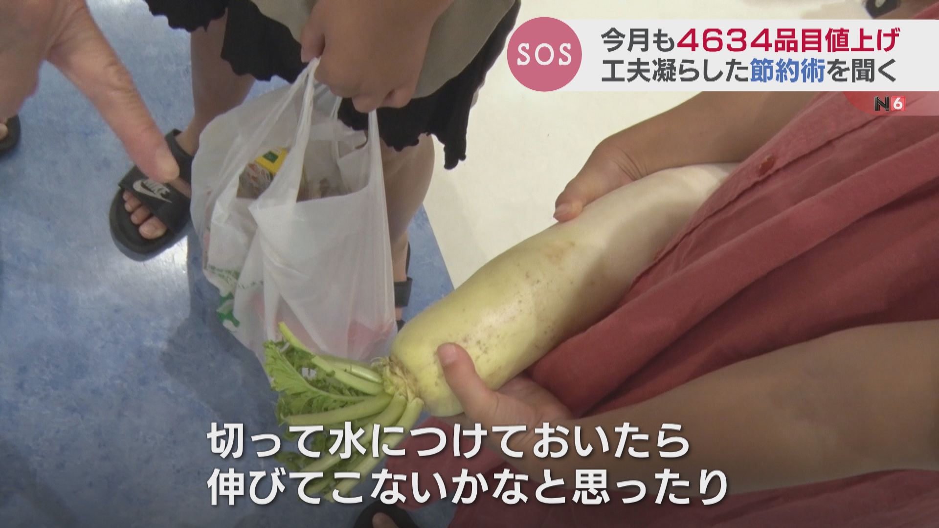 買い物客:「大根の皮をむいたらそれをきんぴらにするとか。ここで切って水につけておいたら伸びてこないかなと思ったり。ニンジンもやるよ。安くなってほしいとは思いますけど…家計が大変ですもん」