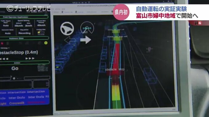 毛田千代丸:「運転席と助手席の間には大きなモニターがありまして3Dマッピングの地図を映しています。この地図上で障害物があればセンサーやカメラで検知して減速ないし停止することになります」