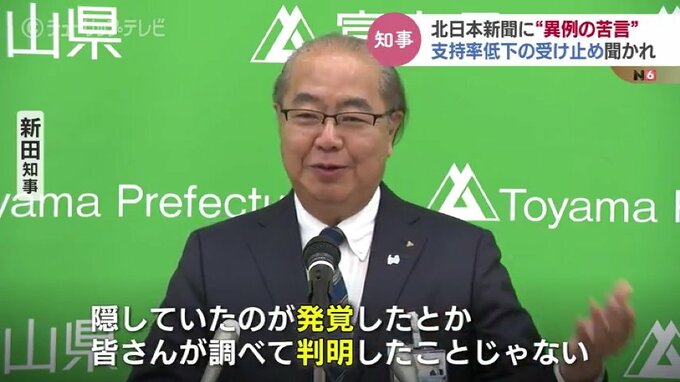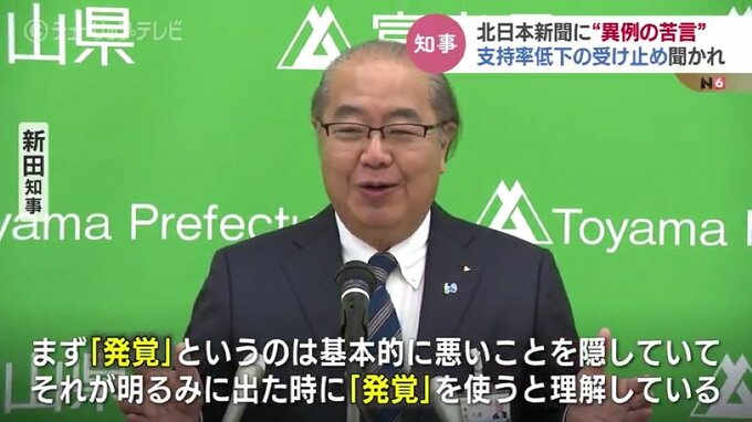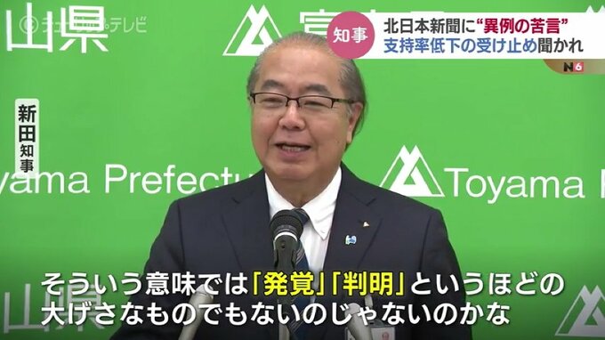 富山県 新田知事:「『発覚』というのは基本的に悪いことを隠していて、それが明るみに出ちゃったよという時に『発覚』という言葉を使うんだと私は理解しています」「私の方が申し上げた事実については、決して発覚したとかですね、隠していたのが発覚したとか、みなさんが調べて判明したとかいうことじゃない。そこらへん言葉遣いに私は違和感を感じたところであります」
