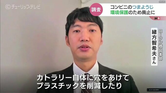 ローソン商品本部 緒方智希夫さん:「カトラリー自体に穴をあけてプラスチックを削減したり、スプーンのヘッドと呼ばれるすくうところをですね、ちょっと小さくして。プラスチック量を削減したり、あまり消費者さまが気づかないところというのはあるかもしれないですが。そういった努力はさせていただいています」「今後も環境に配慮した取り組みを進めていきたいと思います」