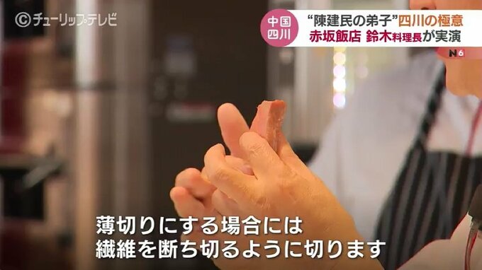 赤坂四川飯店 鈴木広明さん:「お肉には繊維があります。細切りにする場合は繊維に沿って。薄切りにする場合には繊維を断ち切るように切ります」