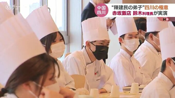 鈴木さんは「中華料理の神様」陳建民のもとで「中華の鉄人」陳建一とともに四川料理を学んだ数少ない料理人の1人。現在は本店の統括料理長を務めています。きょうは調理技術科の1・2年生およそ30人が参加し、一流料理人の技を間近で学びました。