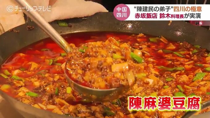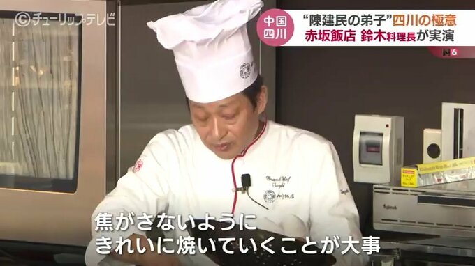 赤坂四川飯店 鈴木広明さん:「唐辛子とか山椒っていうのは、香りを出すのがすごく大事です。どうしたら1番いい状態に香りを出せるかっていったら、焦がさないようにきれいに焼いていくことが大事」