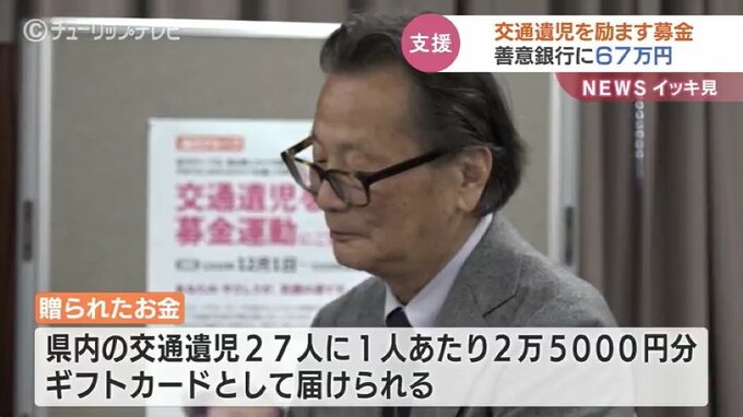 贈られたお金は、交通事故で親を亡くした県内の子どもたち27人に、1人あたり2万5000円分のギフトカードとして届けられます。