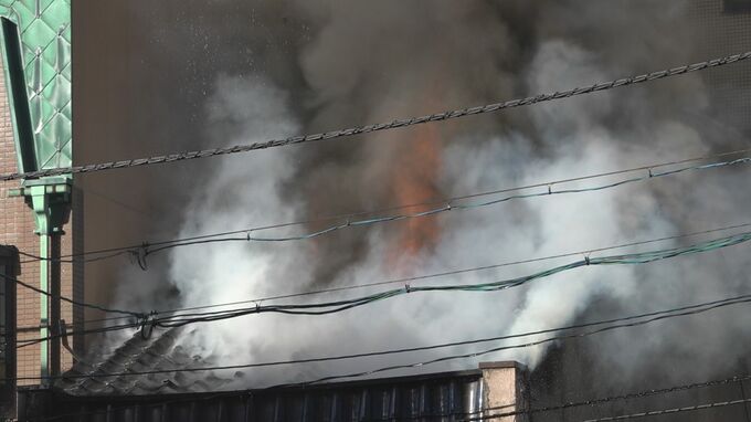 勢いの収まらない黒煙と炎に、白昼の繁華街に鳴り響く消防のサイレン。