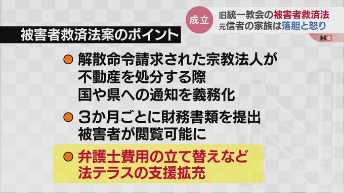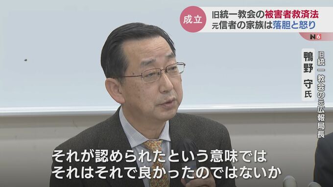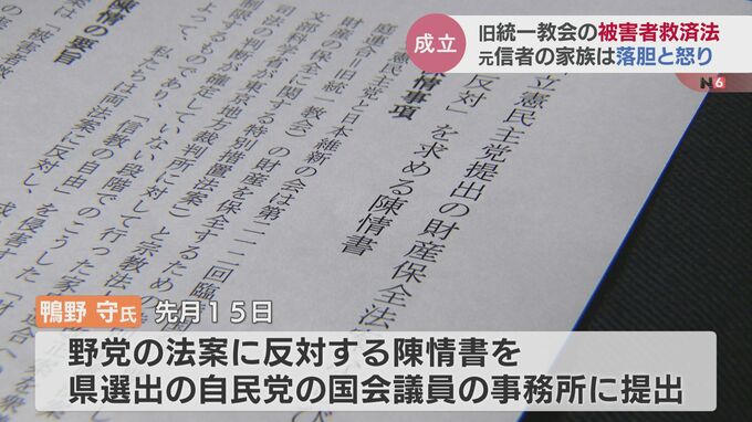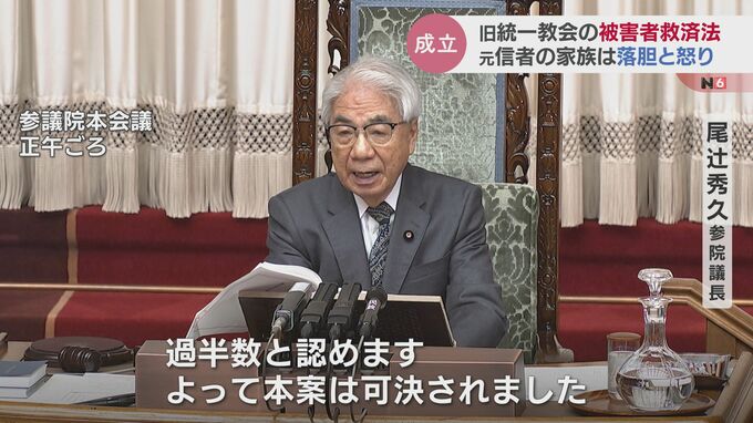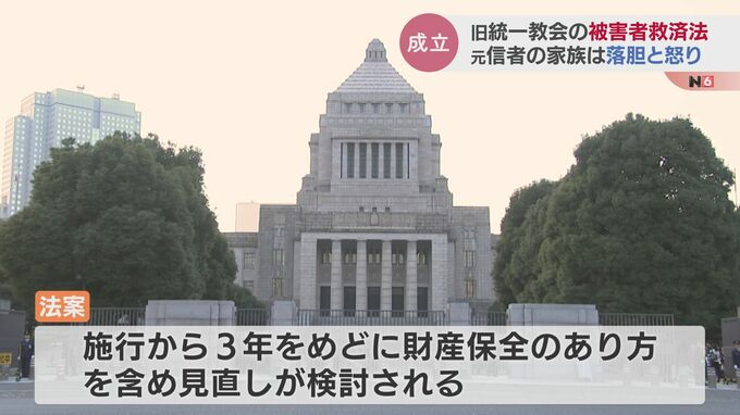 旧統一教会の被害者救済に向けた特例法案が、13日の参議院・本会議で可決、成立しました。海外などに財産の流出を防ぐための保全規定は盛り込まれず、富山県内の元信者の家族は「被害者ではなく、旧統一教会を救済する内容だ」と怒りをあらわにしました。