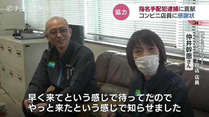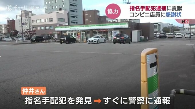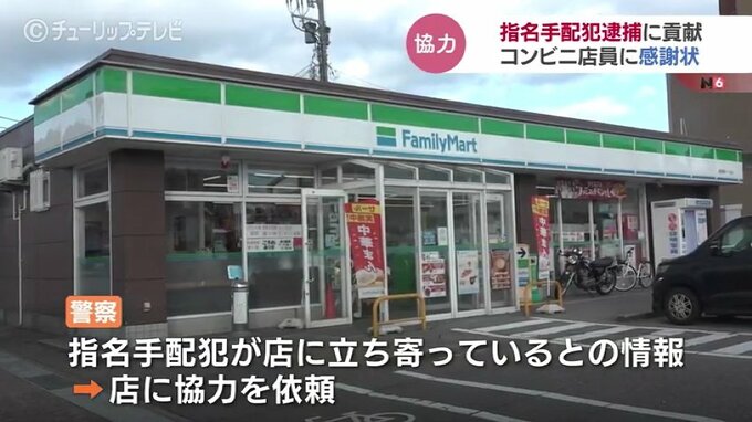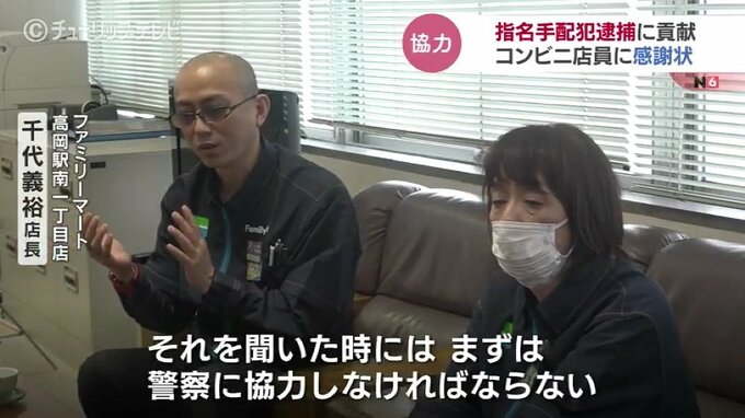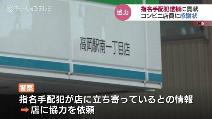 コンビニにあらわれた指名手配犯に気づき、冷静な判断で警察に通報、逮捕に貢献した富山県高岡市のコンビニ店店長と店員に感謝状が贈られました。