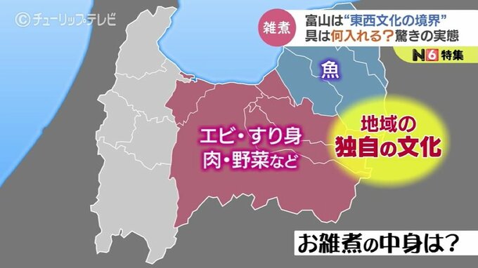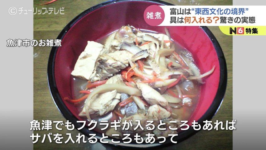 中井精一教授:「独自の文化って何って言ったら彼らの日常生活の土台に乗っかった文化ということ。漁業を中心としたような生業で成り立っている食べ物。色んな魚。あるところではフクラギ入れてるし黒部の生地なんかの漁港があるところでは色んな魚が入っていたりする。魚津なんかでもフクラギが入るところもあればサバを入れるところもあってごちそうがお雑煮に反映する」「こんなにコンパクトな県なのに西と東でここまで違うというのはよその都道府県では無いと思います」