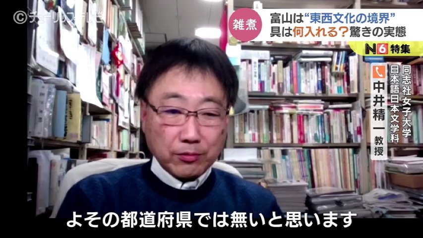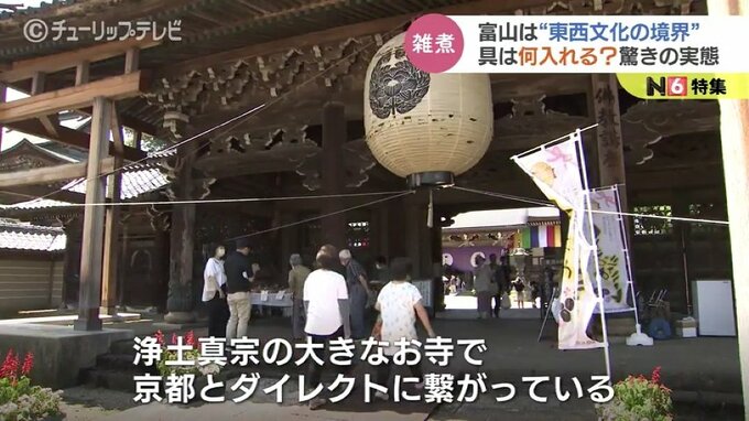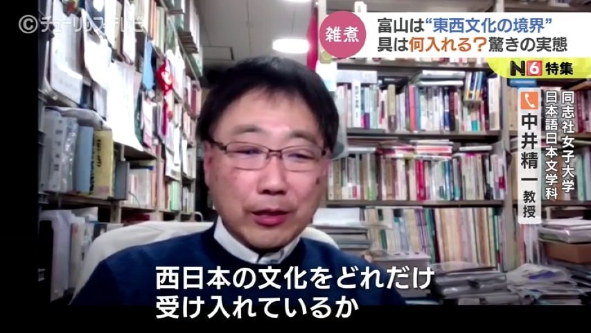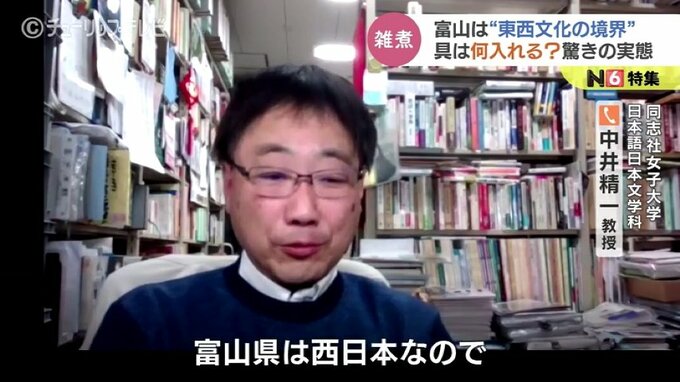 中井精一教授:「富山県の文化は、いくつかの流れによって出来ている。富山県西日本なので、西日本の文化をどれだけ受け入れているか、受け入れていないかっていうことで文化の差が出ている」「砺波とか小矢部はお寺がありますよね。瑞泉寺とか、善徳寺とか。浄土真宗の大きなお寺で京都とダイレクトに繋がっているわけですよ。何も入らないようなお餅と汁と薬味だけみたいなお雑煮が多い」