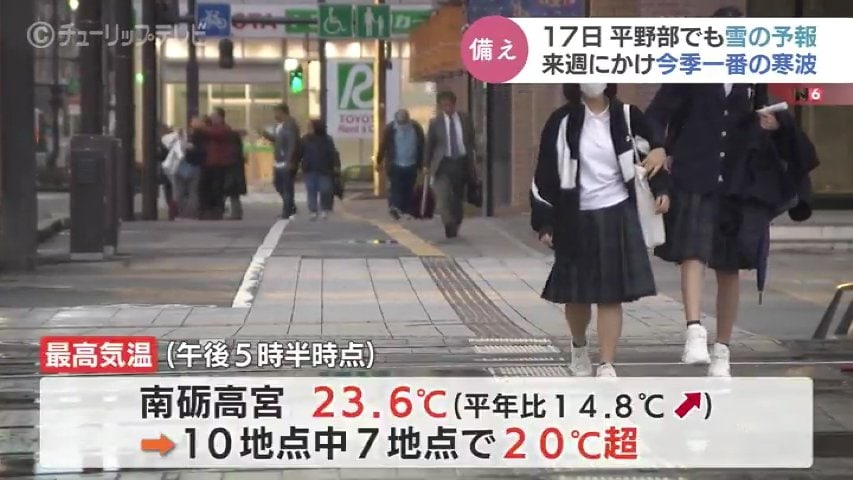 15日の富山県内は、前線に向かって流れ込む暖かく湿った空気の影響で、朝から雨の一日となりました。日中にかけて気温が上昇し、南砺高宮で平年を14.3℃も上回る23.1℃となるなど、4地点で20℃を超える季節外れの暖かさとなりました。