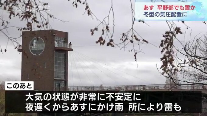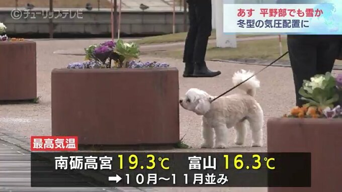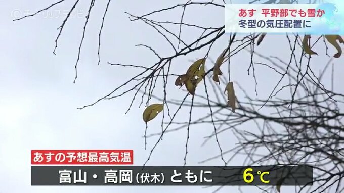 最高気温は富山・高岡市の伏木ともに6℃ときょうから10℃以上下がり真冬並みの寒さとなる予想で、体調管理に充分な注意が必要です。