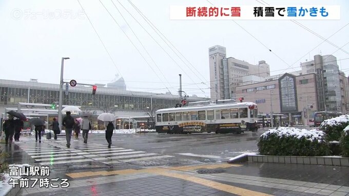 ようやく初雪が降った富山県内は、18日も冬型の気圧配置が続き、断続的に雪が降っています。一面の雪景色に富山市内では雪かきをする人の姿が見られました。