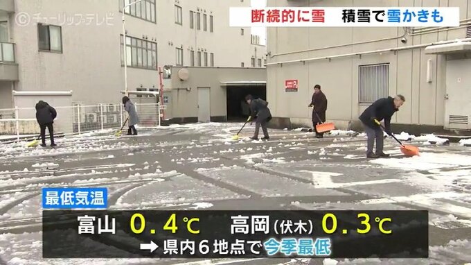 富山市内の駐車場などでは、朝から雪かきをする人の姿が見られました。朝の最低気温は、富山で0.4℃、高岡市の伏木で0.3℃など県内10の観測地点のうち6地点で今シーズン最低を記録しています。