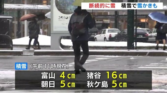 冬型の気圧配置の影響で富山県内は、17日夜から18日朝にかけて各地で雪が降り、午前11時現在の積雪は富山で4センチ猪谷で16センチなどとなっています。