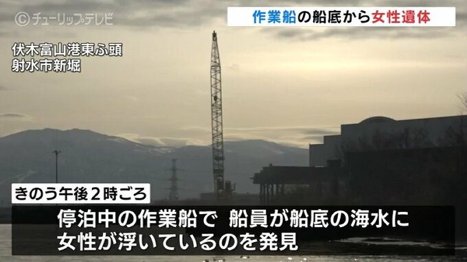 警察によりますと、18日午後2時ごろ、射水市の伏木富山港東ふ頭に停泊していた作業船で、船員が、船底に貯まっていた海水に女性がうつぶせの状態で浮いているのを見つけました。船員が消防に通報し、その場で死亡が確認されました。