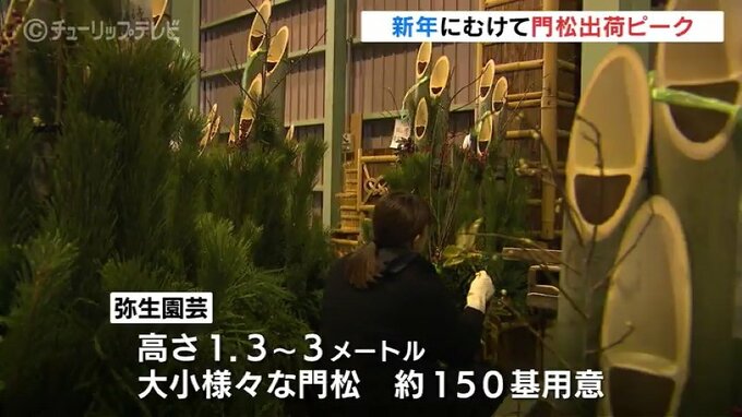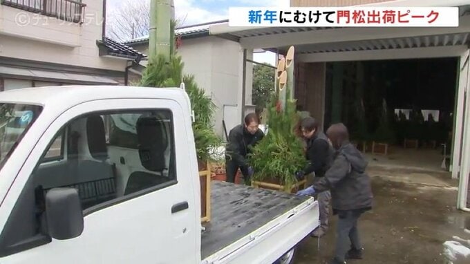 この店では11月中旬から門松の製作を始め、今年は高さ1.3メートルから3メートルまで大小様々な門松、およそ150基を用意し、従業員が手際よく門松をトラックに積み込んでいました。