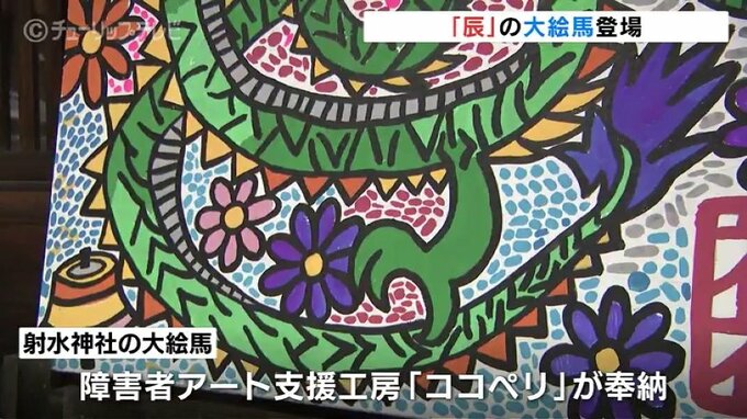 射水神社に設置されたのは、来年の干支「辰」が描かれた大絵馬で、毎年、高岡市の障害者アート支援工房「ココペリ」が奉納しています。