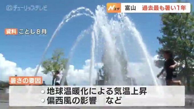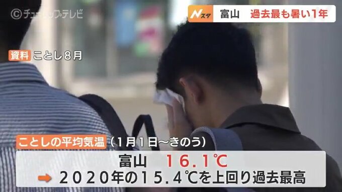 日本気象協会によりますと、ことし1月1日からきのうまでの1年間の富山の平均気温は16.1℃とこれまで最高を記録していた2020年の15.4℃を大きく上回り過去最も暑い1年となりました。