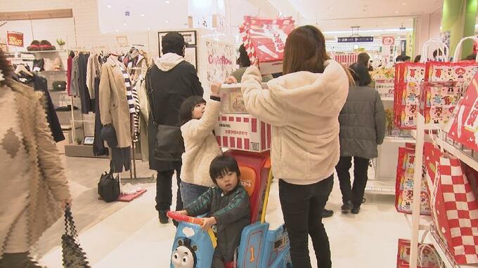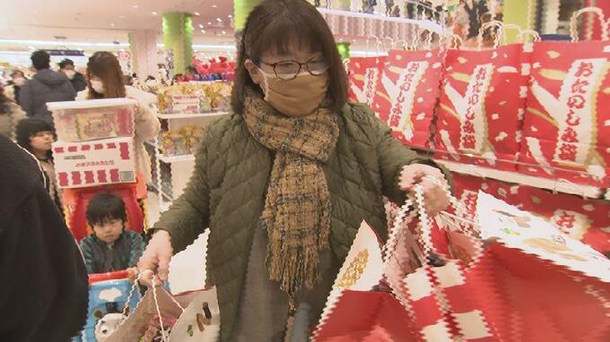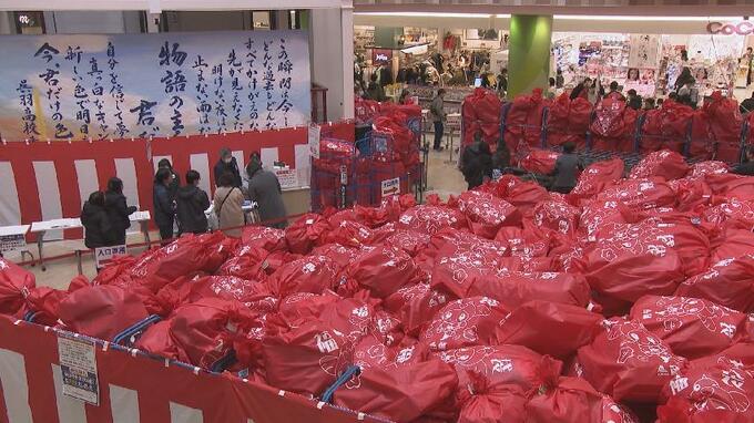 通常より1時間早い午前9時にオープンすると、多くの客が衣類や食料品、雑貨などお目当ての福袋へ一直線。何種類も用意されているなかでも家電や生活用品などが入った1万円福袋が人気で、ことしは事前のウェブ予約で即完売となった800個に加え、88個を当日抽選で販売。660人以上が抽選に参加し、見事運をつかんだ人たちが大きな福袋をゲットしていました。