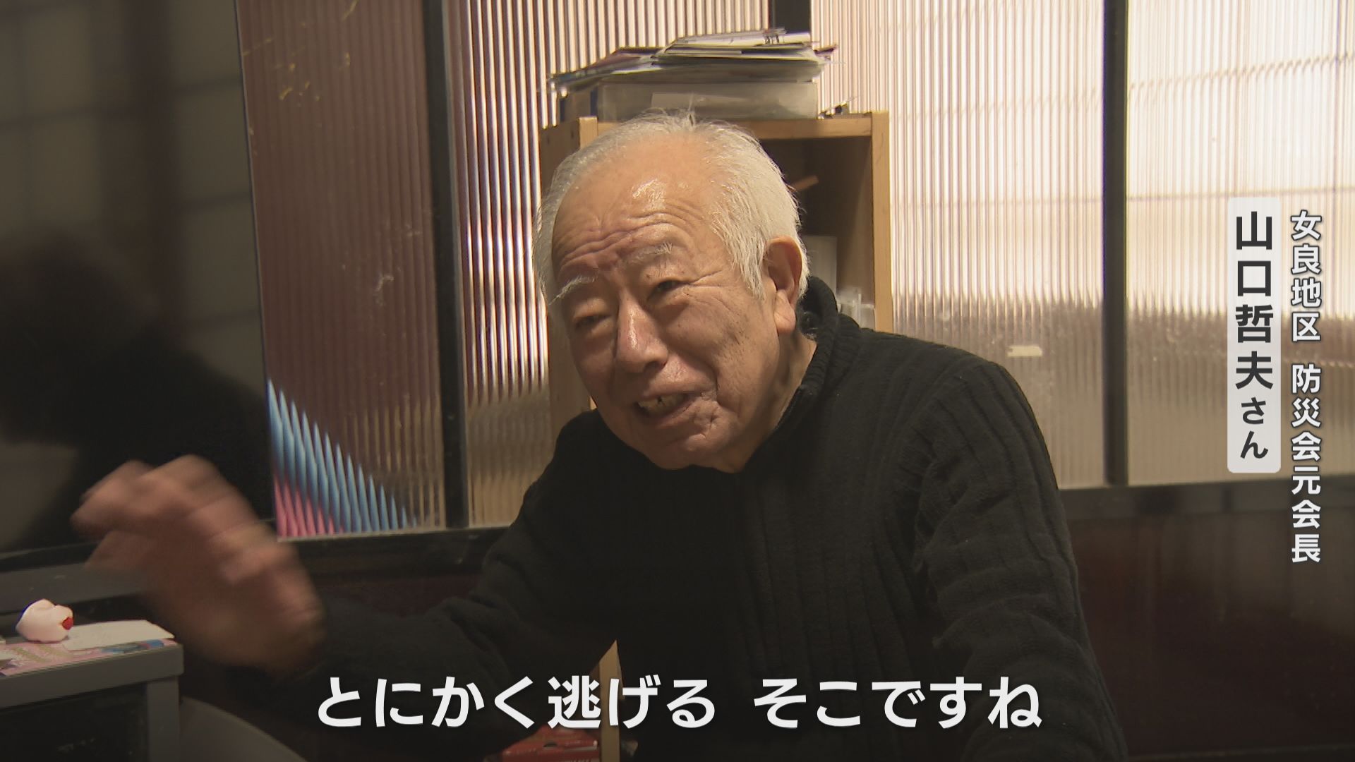 女良地区の防災会元会長山口哲夫さん。地震発生時は帰省していた娘夫婦と孫2人の合わせて6人で自宅にいました。