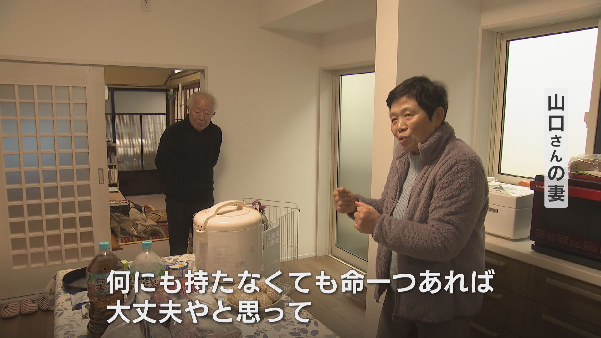 山口さんの妻:「どーんと来たら。もうみんな腰が抜けるような気持ちで。緊急で津波が来る可能性がありますって言うんで何にも持たなくても命一つあれば大丈夫やと思って。もう鍵も家かける余裕もないし何とか命助かれば何とかなるやろうということで道神社へ逃げていったという感じですね」