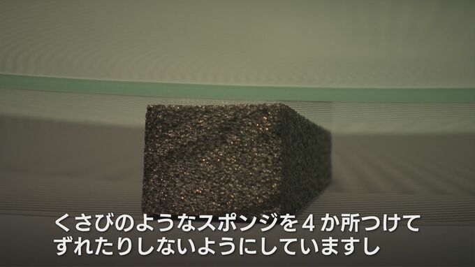 富山市ガラス美術館 土田ルリ子館長:「くさびのようなスポンジを4か所つけてずれたりしないようにしていますし…。真ん中には転倒防止の粘着シートを入れたりしています」