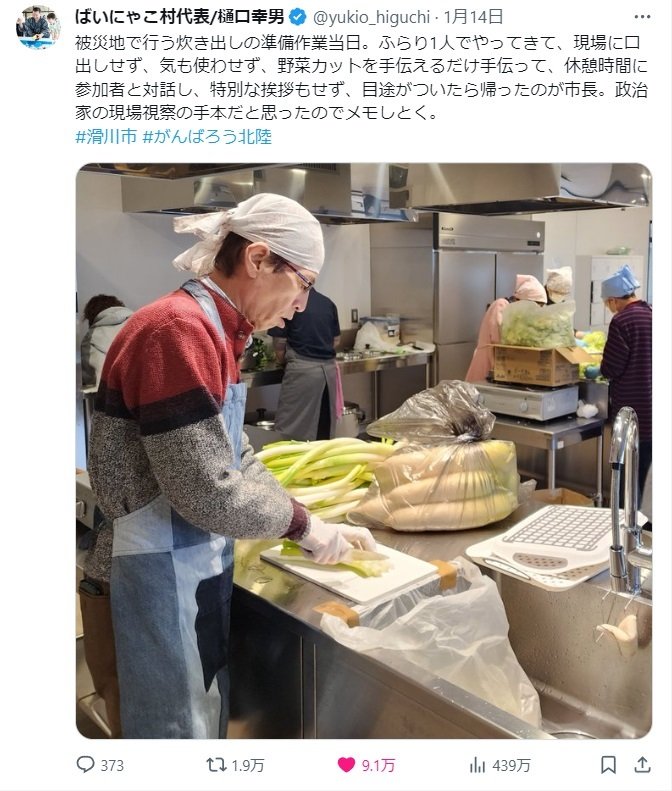 投稿内容:「ふらり1人でやってきて現場に口出しせず、気もつかわせず野菜カットを手伝えるだけ手伝って、休憩時間に参加者と対話し特別な挨拶もせず、目途がついたら帰ったのが市長。政治家の現場視察の手本だと思ったのでメモしとく」