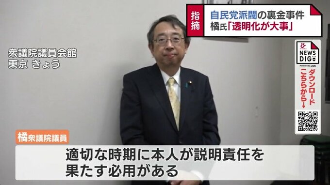 自民党派閥の裏金事件について、無派閥で富山県選出国会議員の橘慶一郎衆議院議員は18日「派閥運営の透明化が必要」だと指摘しています。