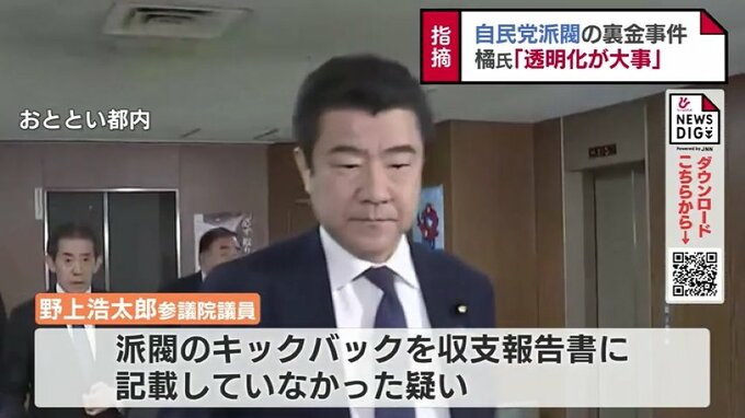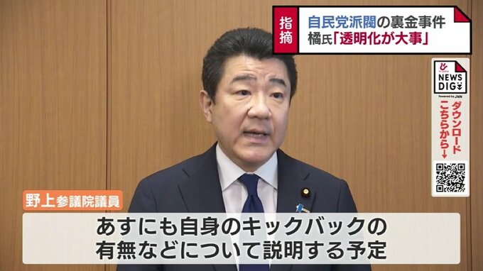 同じく県選出で安倍派に所属する県選出の野上浩太郎参議院議員は、派閥のキックバックを収支報告書に記載していなかった疑いが持たれていますが、橘議員は適切な時に本人が説明責任を果たす必要があると話しています。