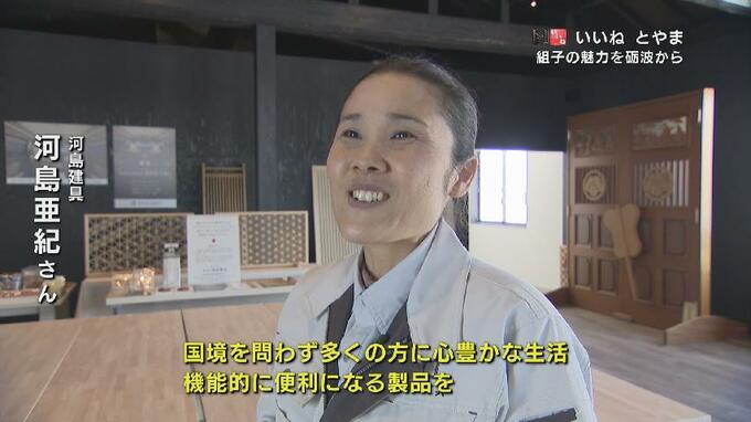 ニュースクリップ 1400年の伝統技術「組子」幾何学的な文様すべてが手仕事…魅力を世界に発信する職人集団「河島建具」富山・砺波市 2024年1月18日(木) 18:12 国内 暮らし・マネー 繊細な手仕事による伝統技術が魅力… 河島建具 河島亜紀さん:「国境を問わず多くの方に心豊かな生活機能的に便利になる製品を届けたいなと思っています」 繊細な手仕事で世界を凌駕する日本の組子。河島さんたちはその伝統技術の魅力を砺波から発信しています。
