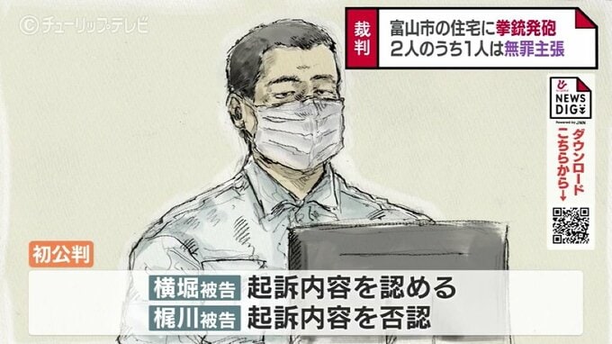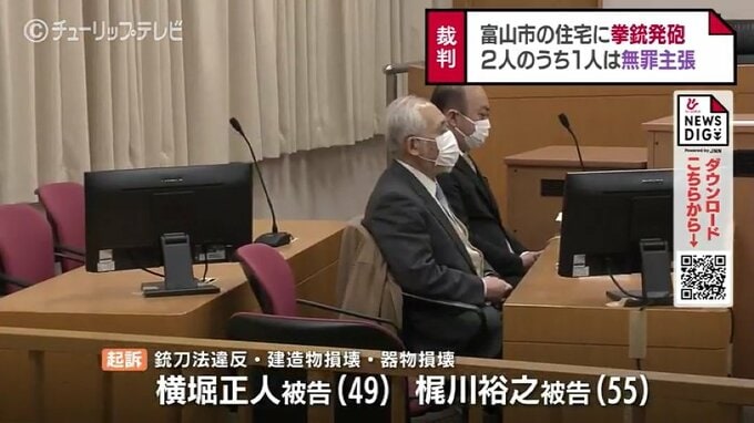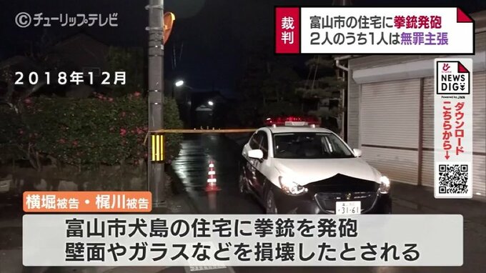 起訴状などによりますと横堀被告と梶川被告は2018年、共謀の上富山市犬島の住宅に拳銃を発砲し壁面やガラスなどを損壊させたとされています。