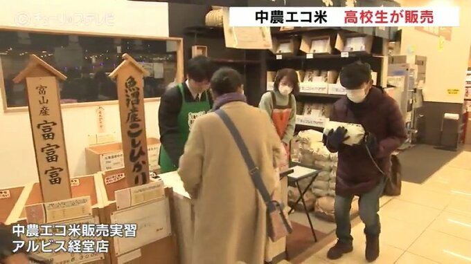 20日、富山市で農業高校の生徒たちが自分たちで育てた米を直接販売する実習を行いました。