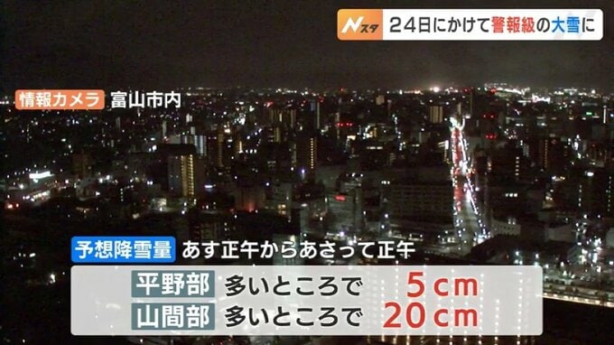 富山県内はあさって23日から強い冬型の気圧配置となり、24日にかけては平地でも警報級の大雪となる所がありそうです。