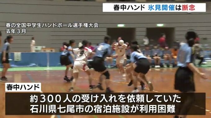 春中ハンドは、県外から90チームが参加する予定でしたが、実行委員会によりますと、約300人の受け入れを依頼していた石川県七尾市の宿泊施設が利用できなくなりました。県西部や富山市のホテルなども探しましたが、全チーム分の宿泊場所を確保できなかったということです。