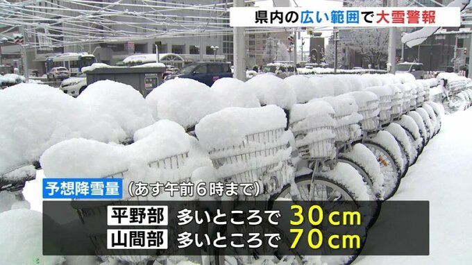 あす朝6時までの24時間予想降雪量は東部西部ともに、いずれも多いところで平野部で30センチ山間部で70センチとなっていて、気象台は水道や路面の凍結、なだれ、電線や樹木への着雪に注意するよう呼びかけています。