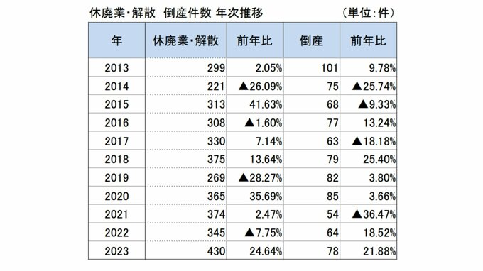 富山県内で休業、廃業もしくは解散した企業は430件で、2年ぶりの増加となり、前の年より24.6パーセント増えました。倒産した企業も78件あり、これらを合わせると508件が