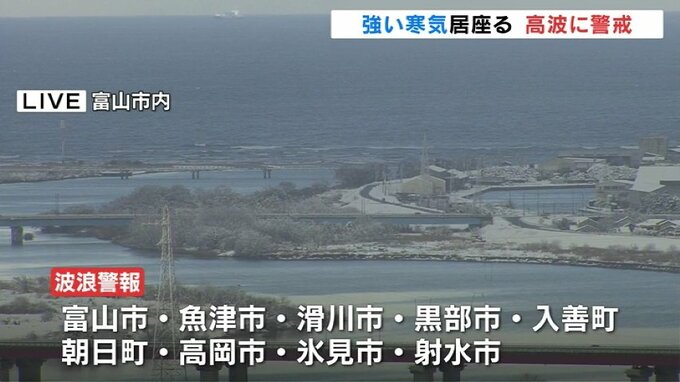 富山県内の沿岸部を抱える9つの市と町には波浪警報が発表されています。予想される波の高さは東部西部ともに5メートルとなっていて、気象台は25日夕方にかけてうねりを伴った高波に警戒を呼びかけています。