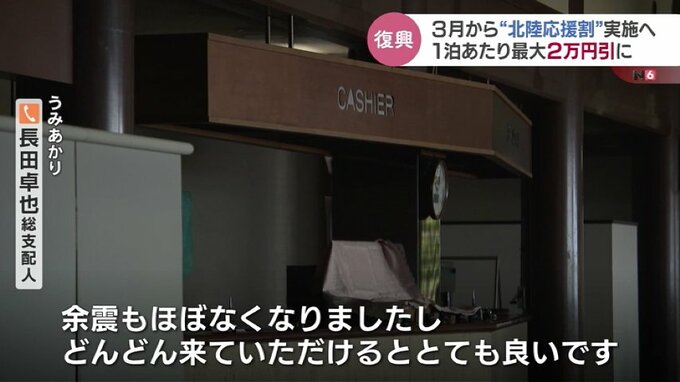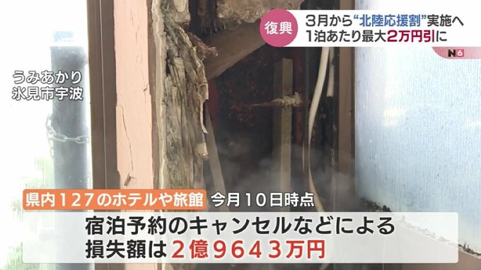 富山県のまとめでは、1月10日時点で県内127のホテルや旅館での宿泊予約のキャンセルなどによる損失額は3億円近くに上ることがわかっています。うみあかりでは天井の一部が落ちたり床に亀裂が入るなどの被害を受けましたが、「北陸応援割」が導入される見込みの3月までには修復工事を終えたいとしています。